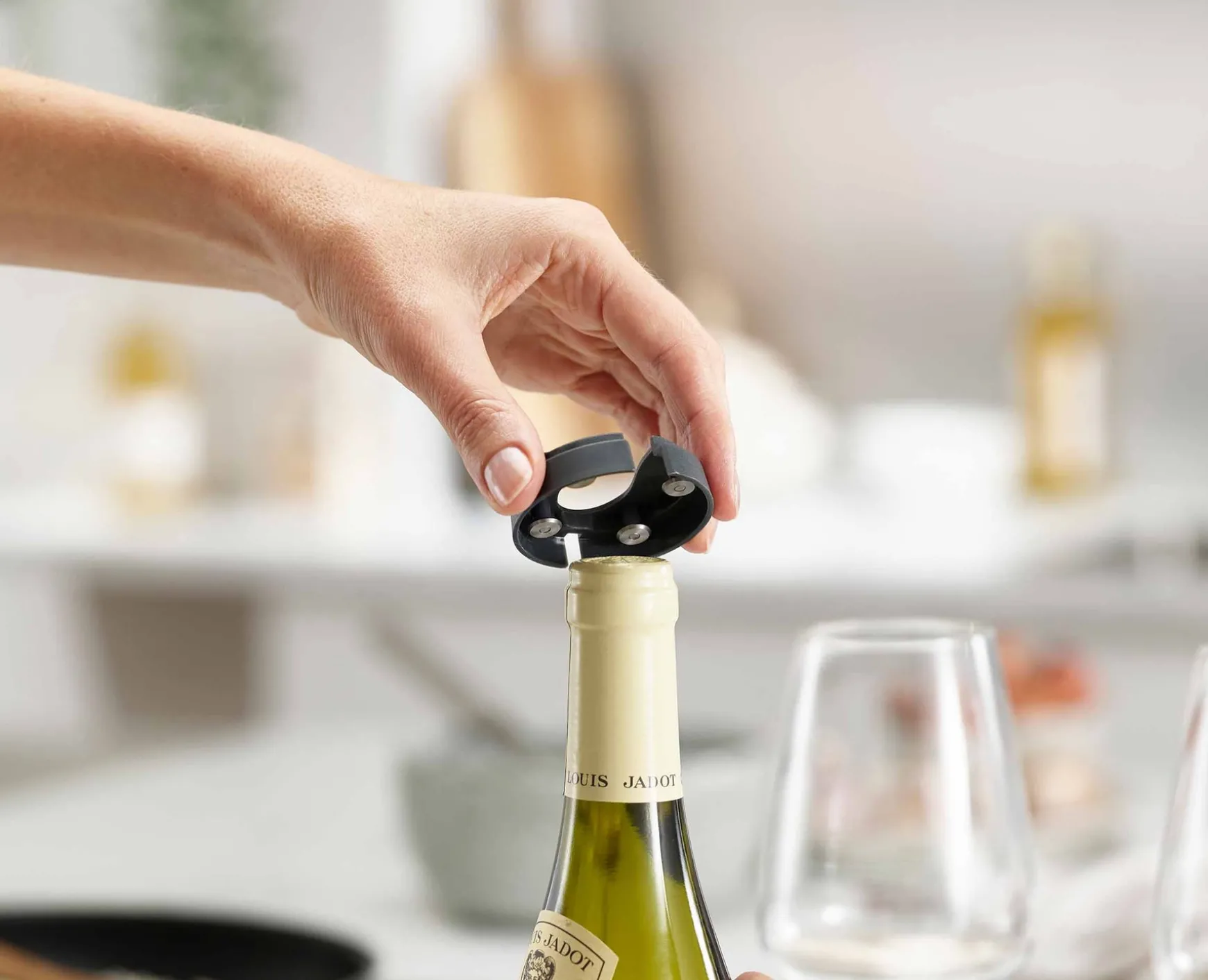 1. Place foil cutter onto neck of bottle, squeeze sides and twist to cut