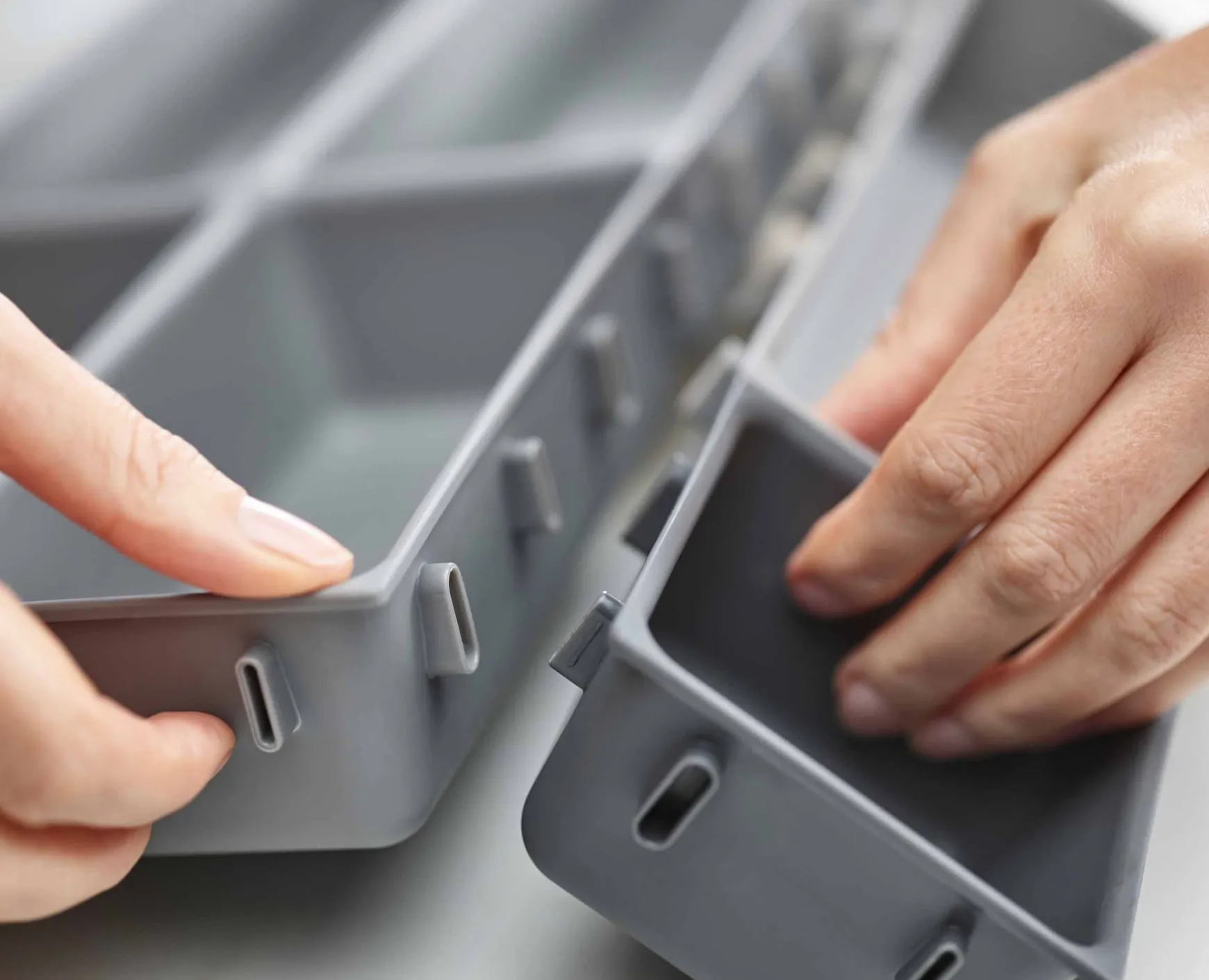 This drawer storage solution includes seven individual trays of different sizes that are able to be clipped together on all sides, allowing you to arrange them in any order to fit your drawer space.