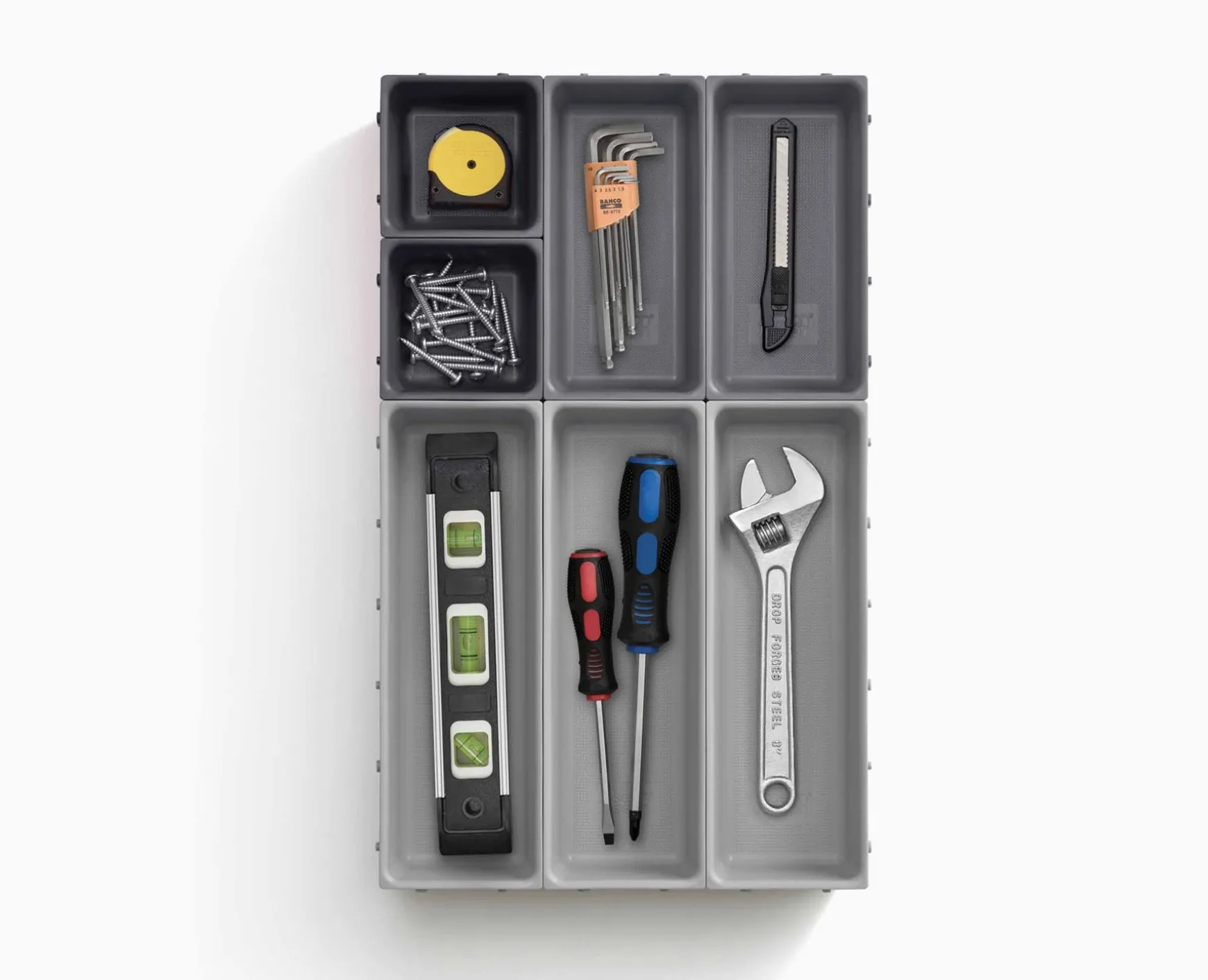 This drawer storage solution includes seven individual trays of different sizes that are able to be clipped together on …
