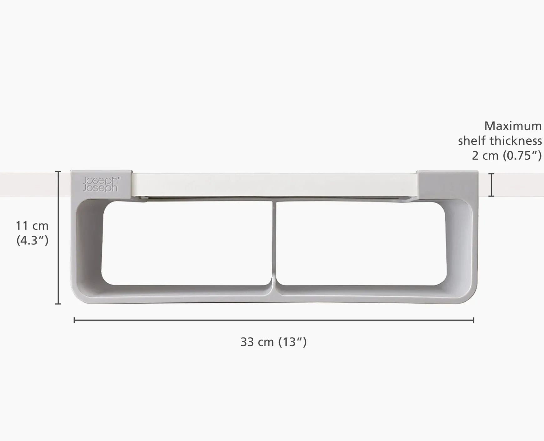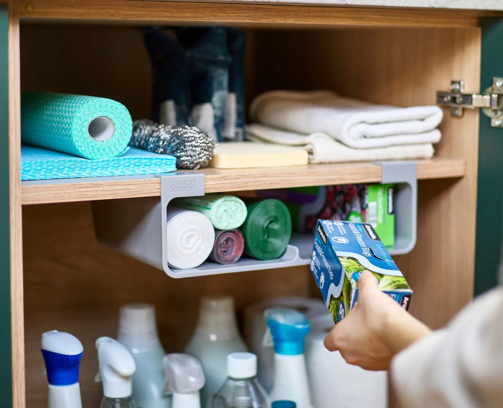 Utilize unused space with this clever organizer that secures neatly underneath your shelf. Ideal for decluttering your drawers, it holds large plastic wrap and foil rolls securely making them easy to access.