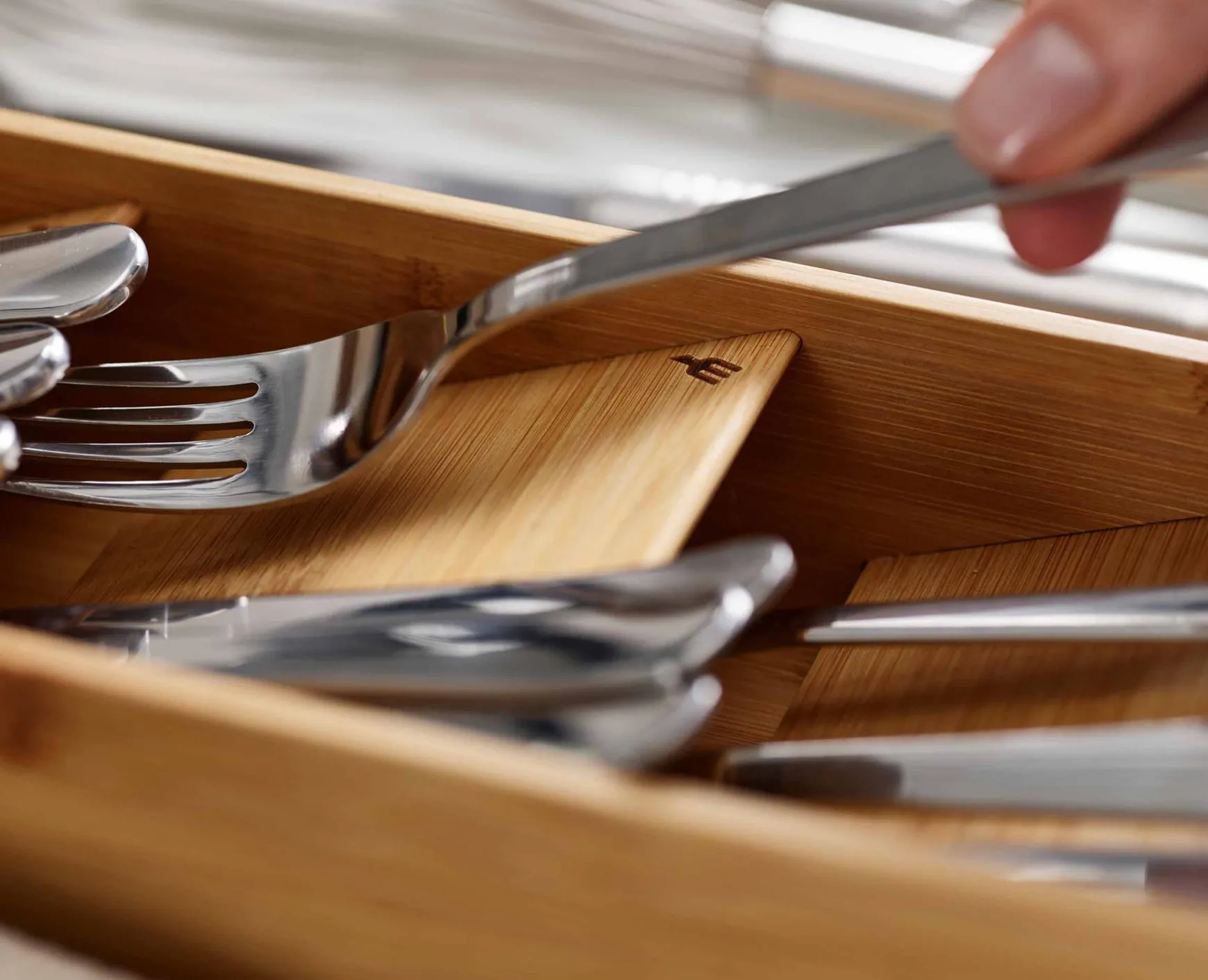 Made from beautiful natural bamboo, this revolutionary design is such a simple but effective idea. By layering each compartment on top of each other, it enables you to store a full cutlery set in less than half the space of a conventional cutlery tray.