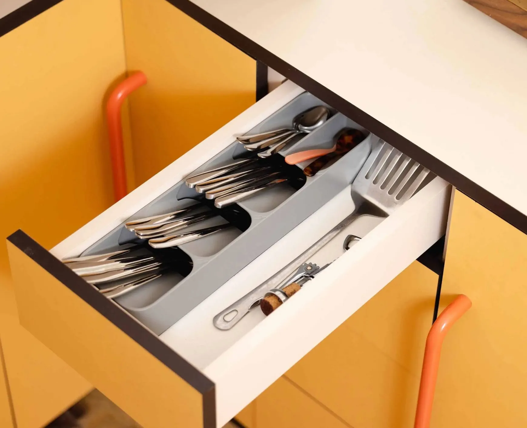 Keep your kitchen drawers in order with this compact storage solution. The unique tray features angled, over-lapping cutlery compartments that take up less room so you can combine two drawers into one.