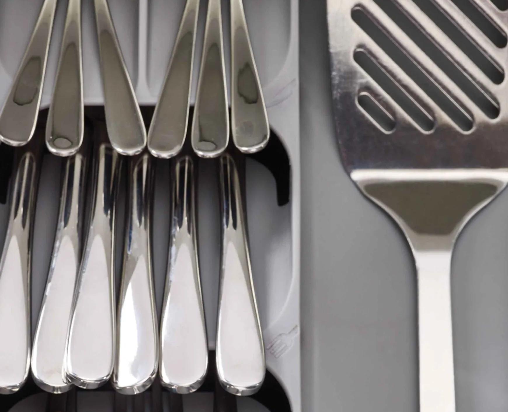 Organize your kitchen drawer with this clever storage solution. The design has tiered compartments for your cutlery as well as space for utensils and gadgets so you can easily fit two drawers into one.