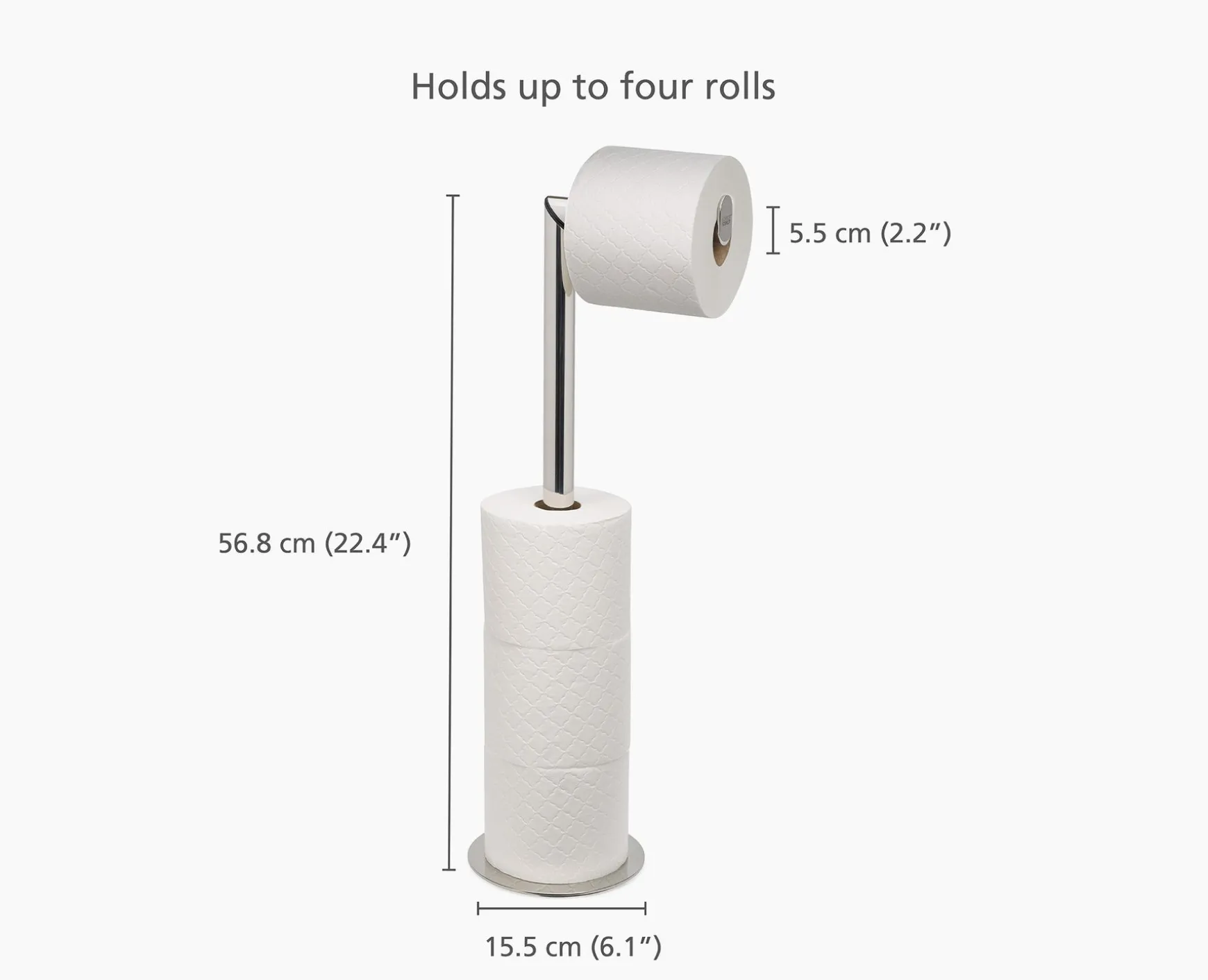 - Holds up to four toilet paper rolls at a time.