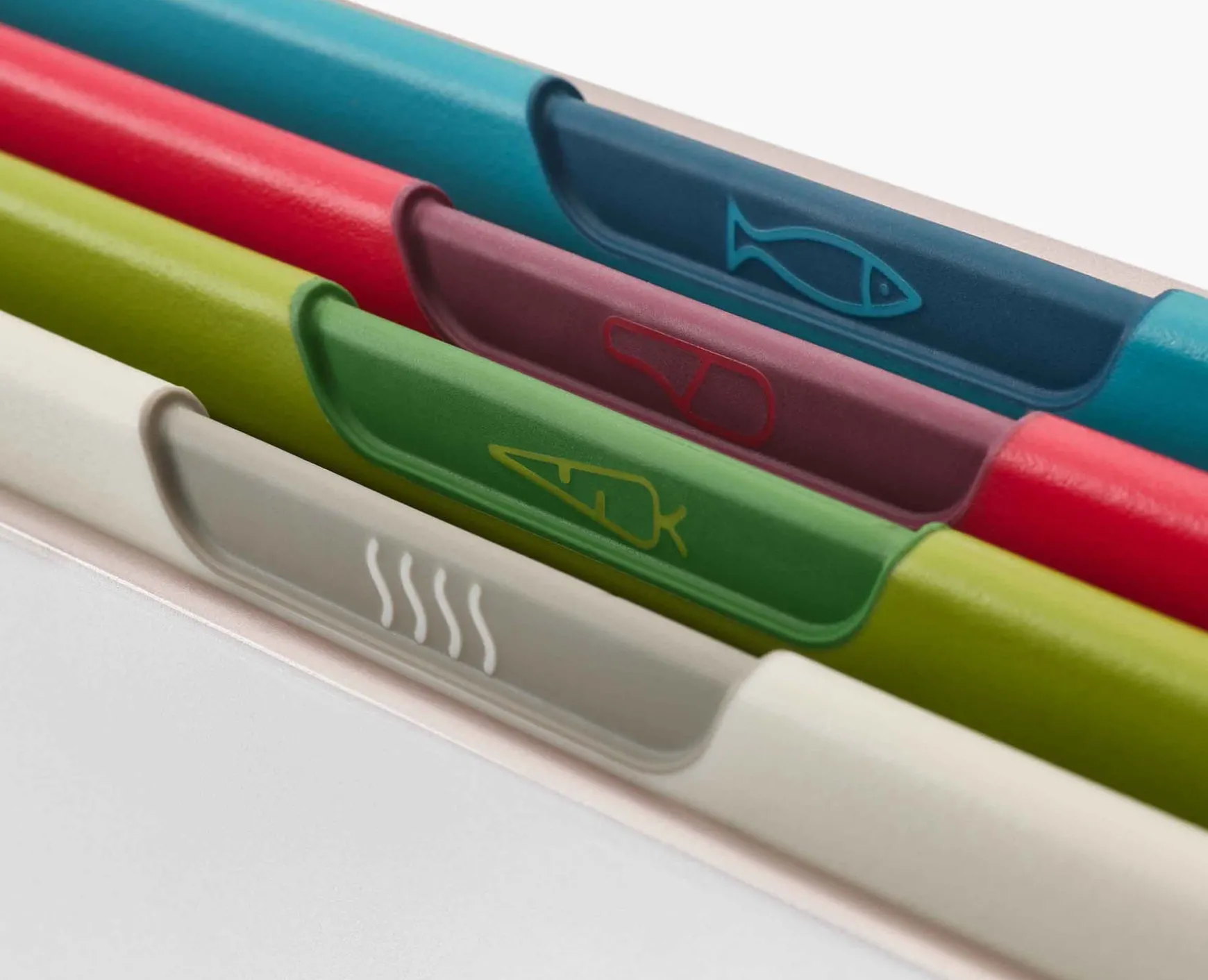 - Colour-coded boards with icons indicating which food type they should be used for – raw meat, raw fish, vegetables or cooked food