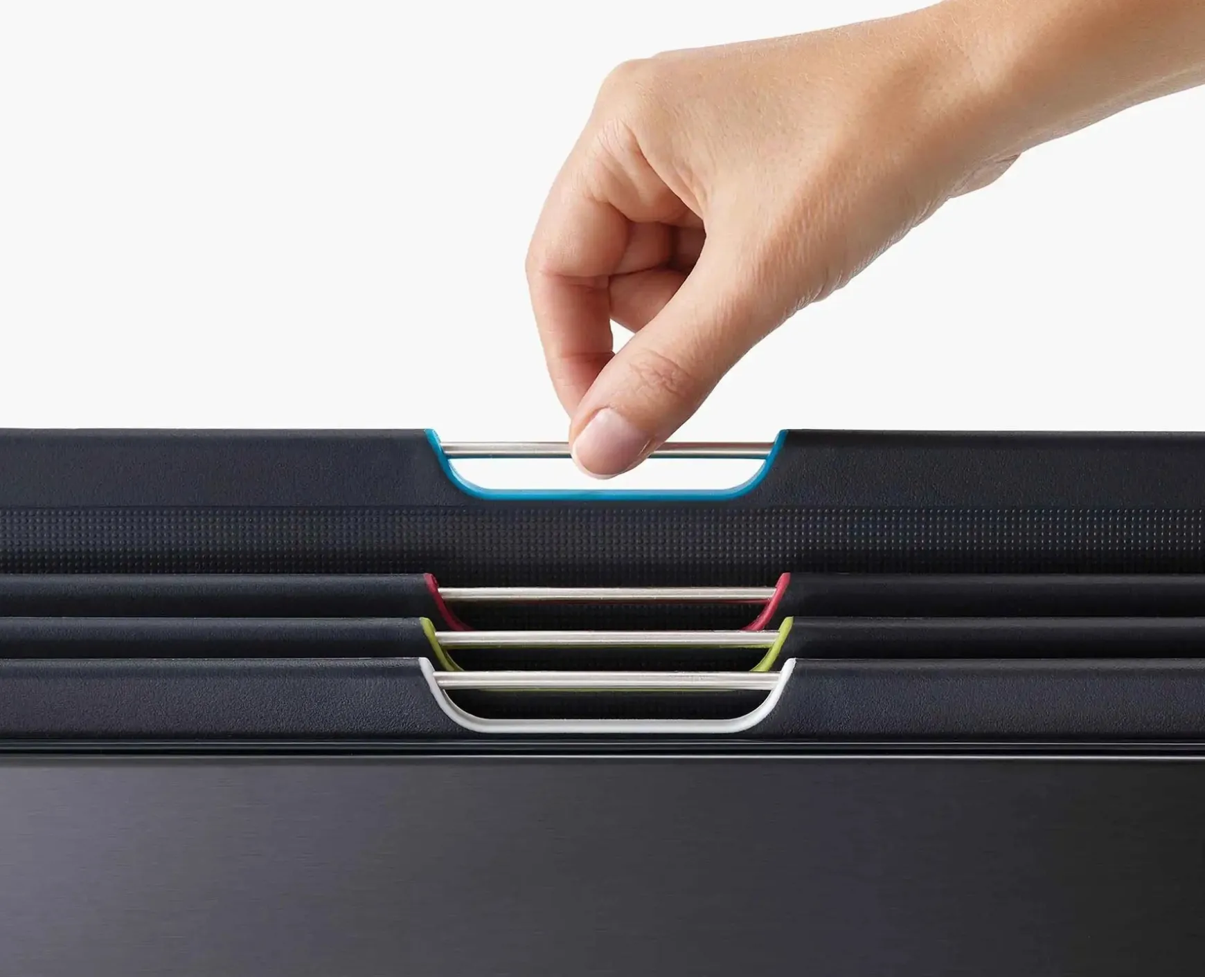Our 4-piece black cutting cutting board set, Folio™ Steel, is perfect for keeping all your boards organised and easy to access. Each cutting board features knife-friendly textured surfaces and colour-coded details to help make food prep more hygienic and efficient. The finishing touch? A stainless-steel case that keeps the boards neat and tidy on the worktop.