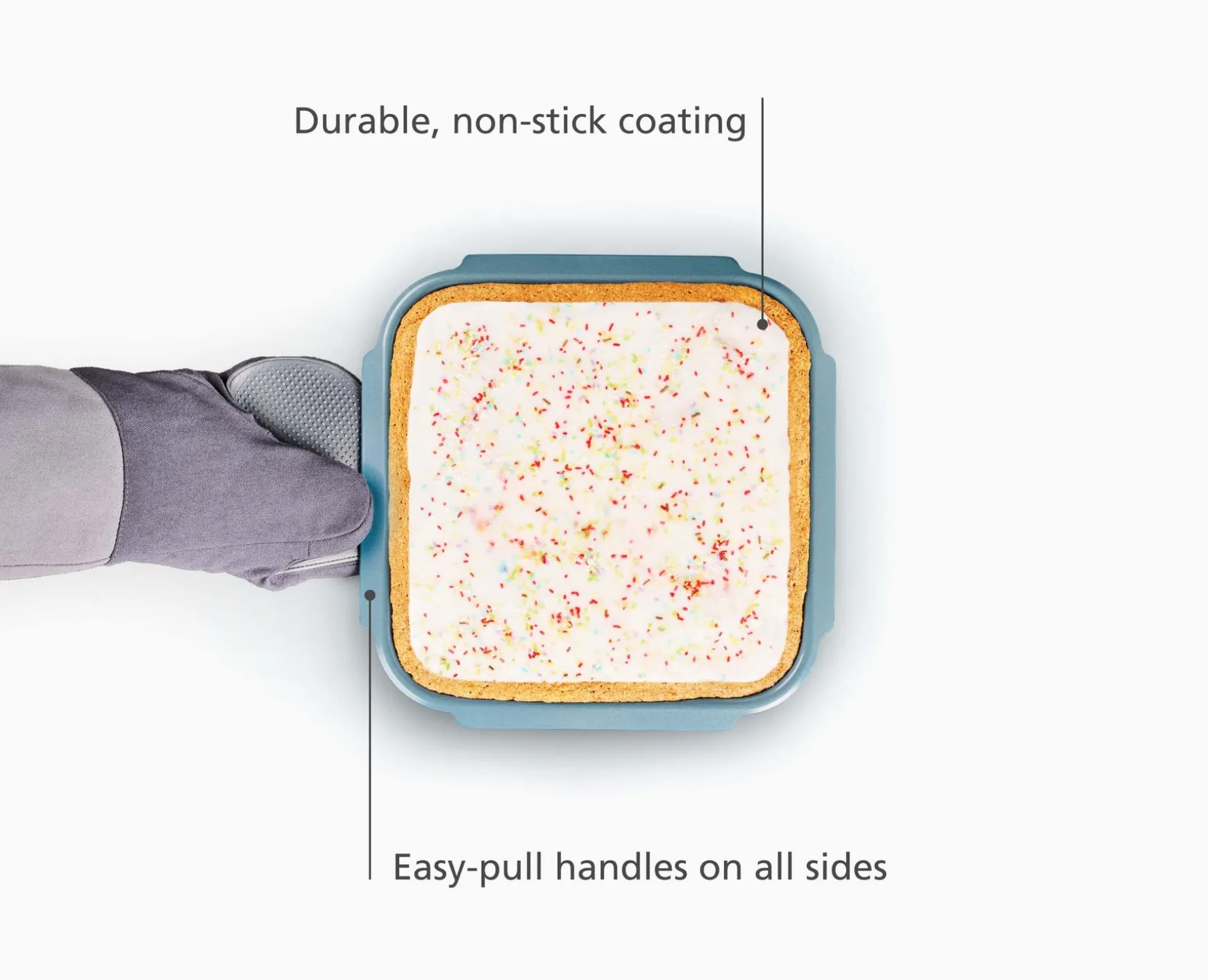 This stackable baking sheet features easy-pull handles on the sides to provide a larger gripping point when wearing oven gloves, making it easier and safer to handle.