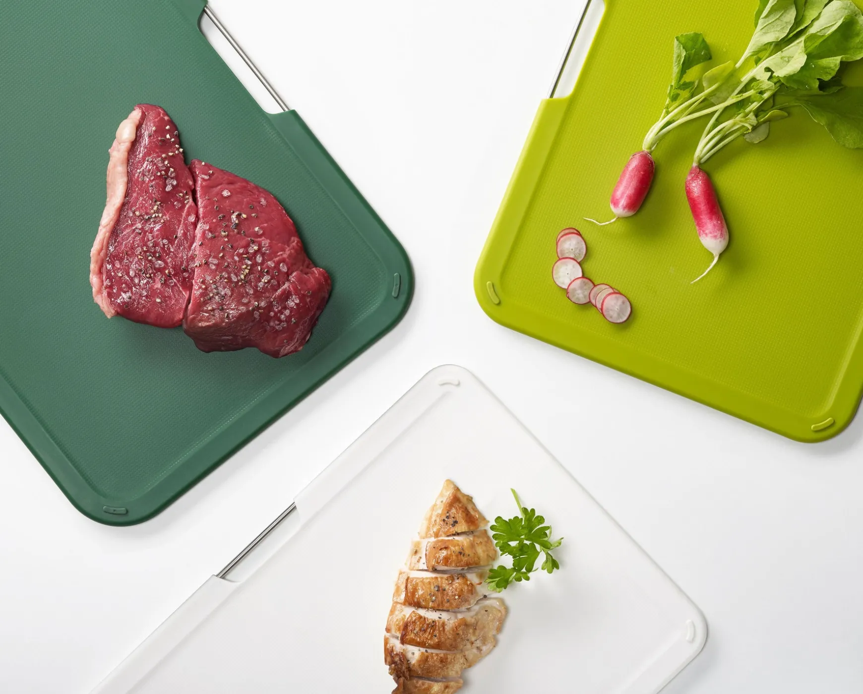 - Colour-coded cutting boards with non-slip feet