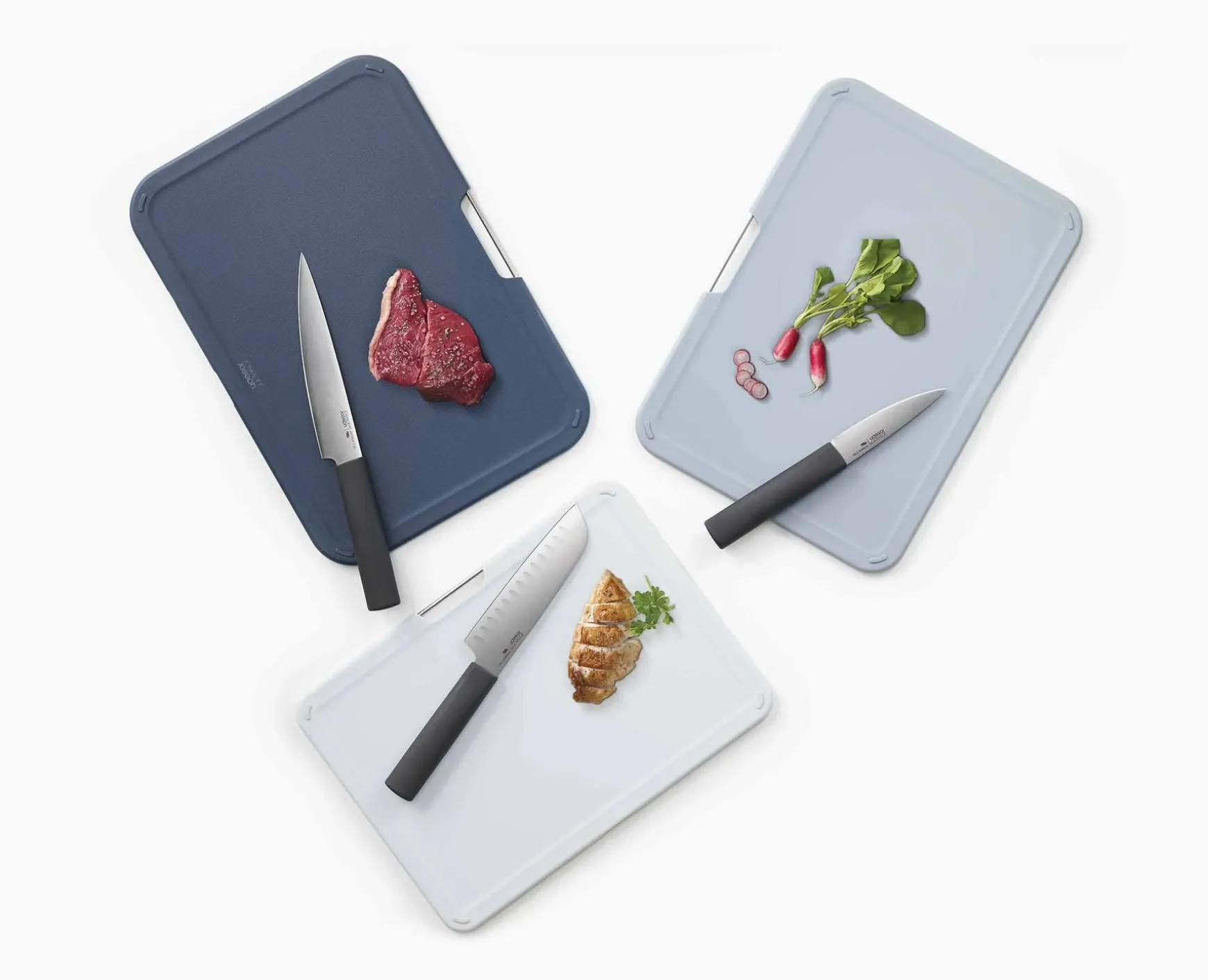 - Colour-coded cutting boards with non-slip feet