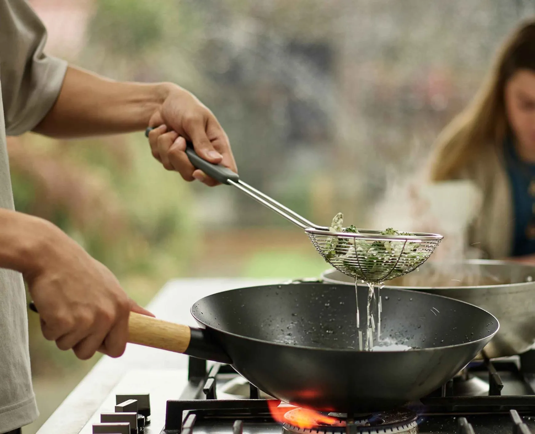 This handy wok utensils set includes a silicone turner, silicone spoon, and a stainless-steel wire skimmer, all with han…