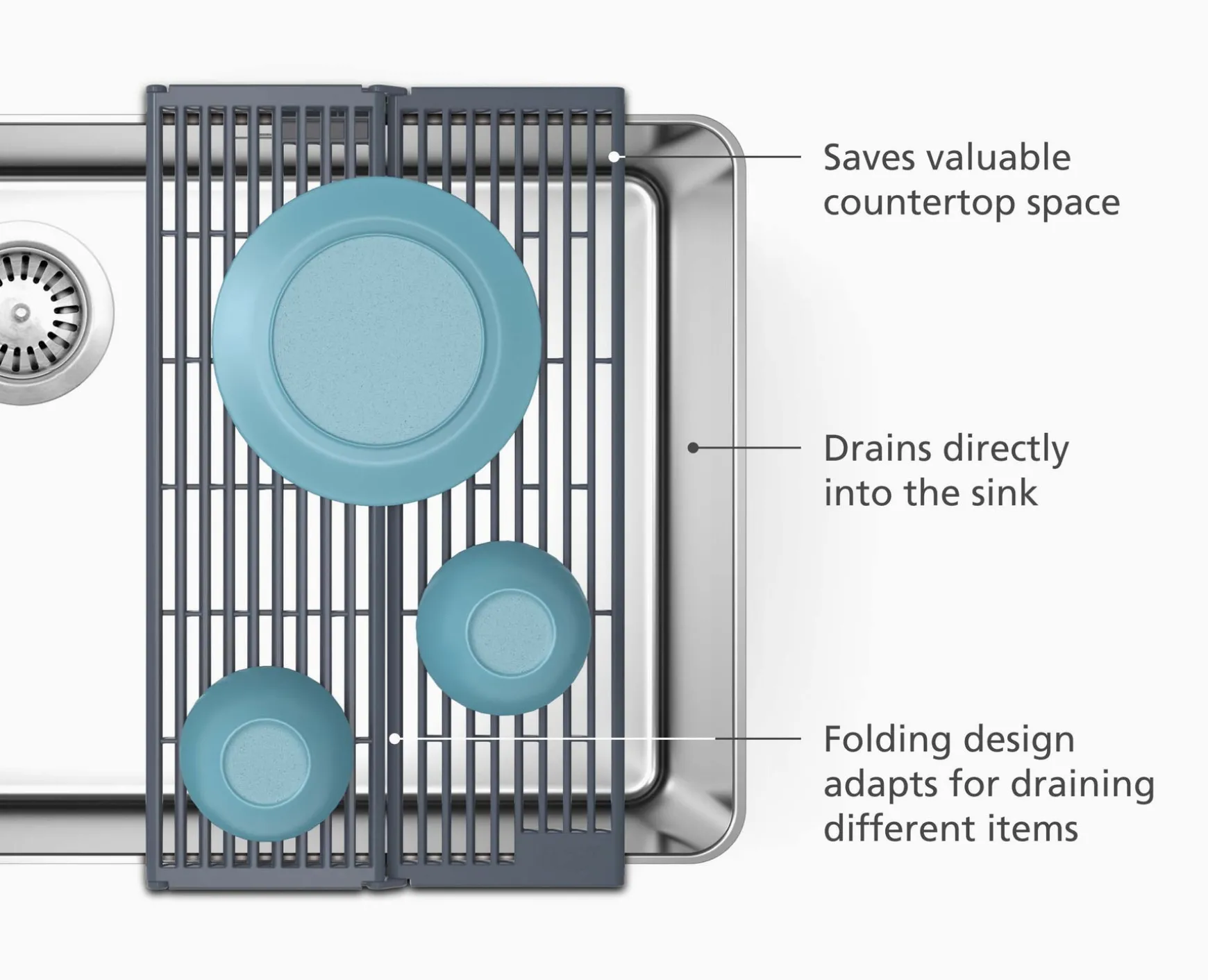 This adjustable over-sink drainer provides additional drying space and can be folded to create more or less room.