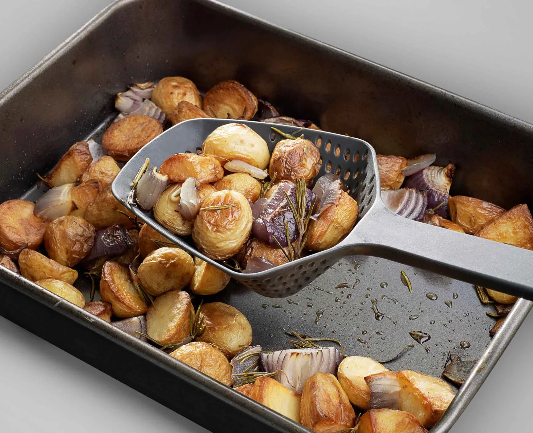 This simple kitchen utensil allows you to scoop, drain and serve food straight from a hot pan or baking tray.