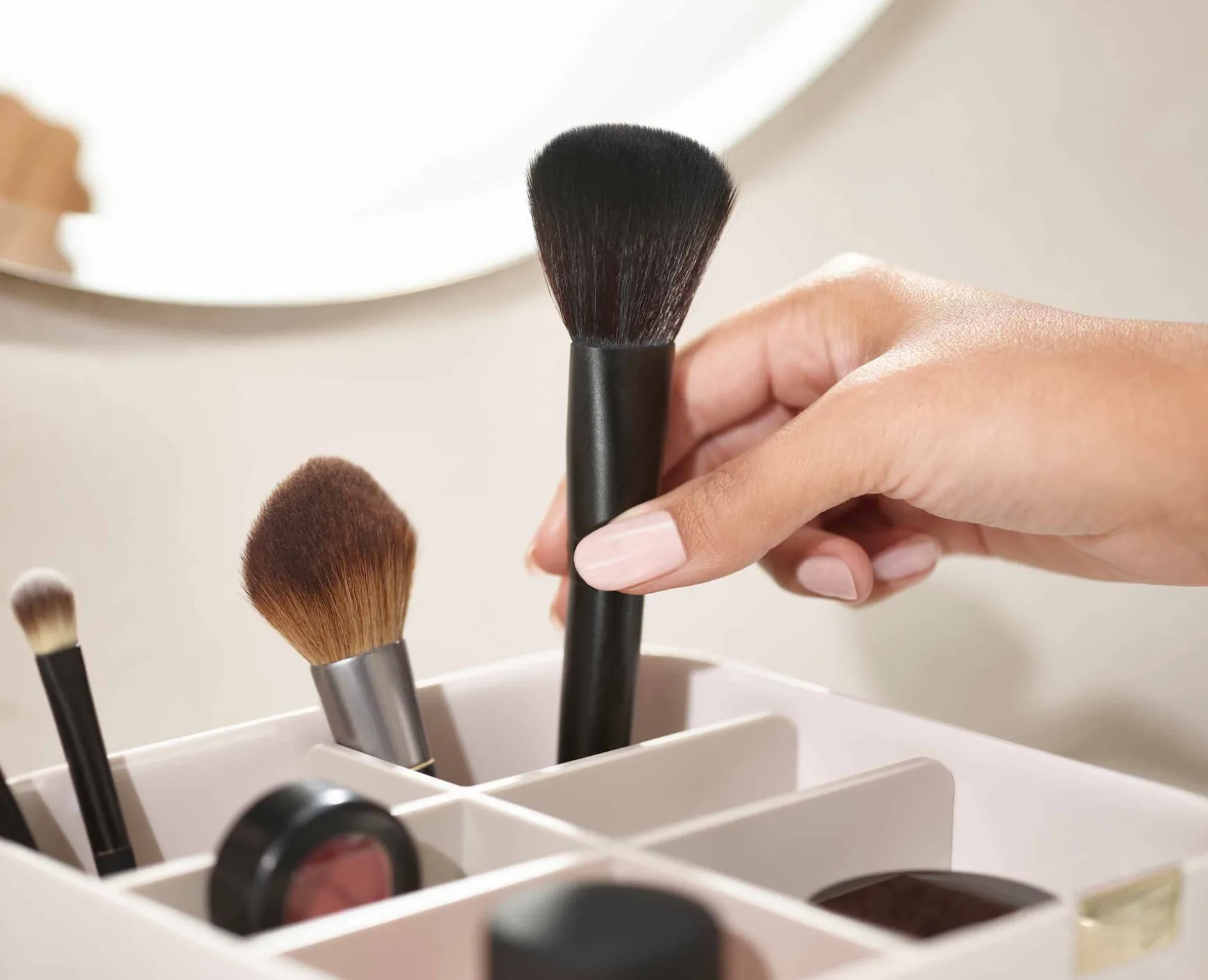 - Deep compartments for brushes, mascaras and eye-liner pencils