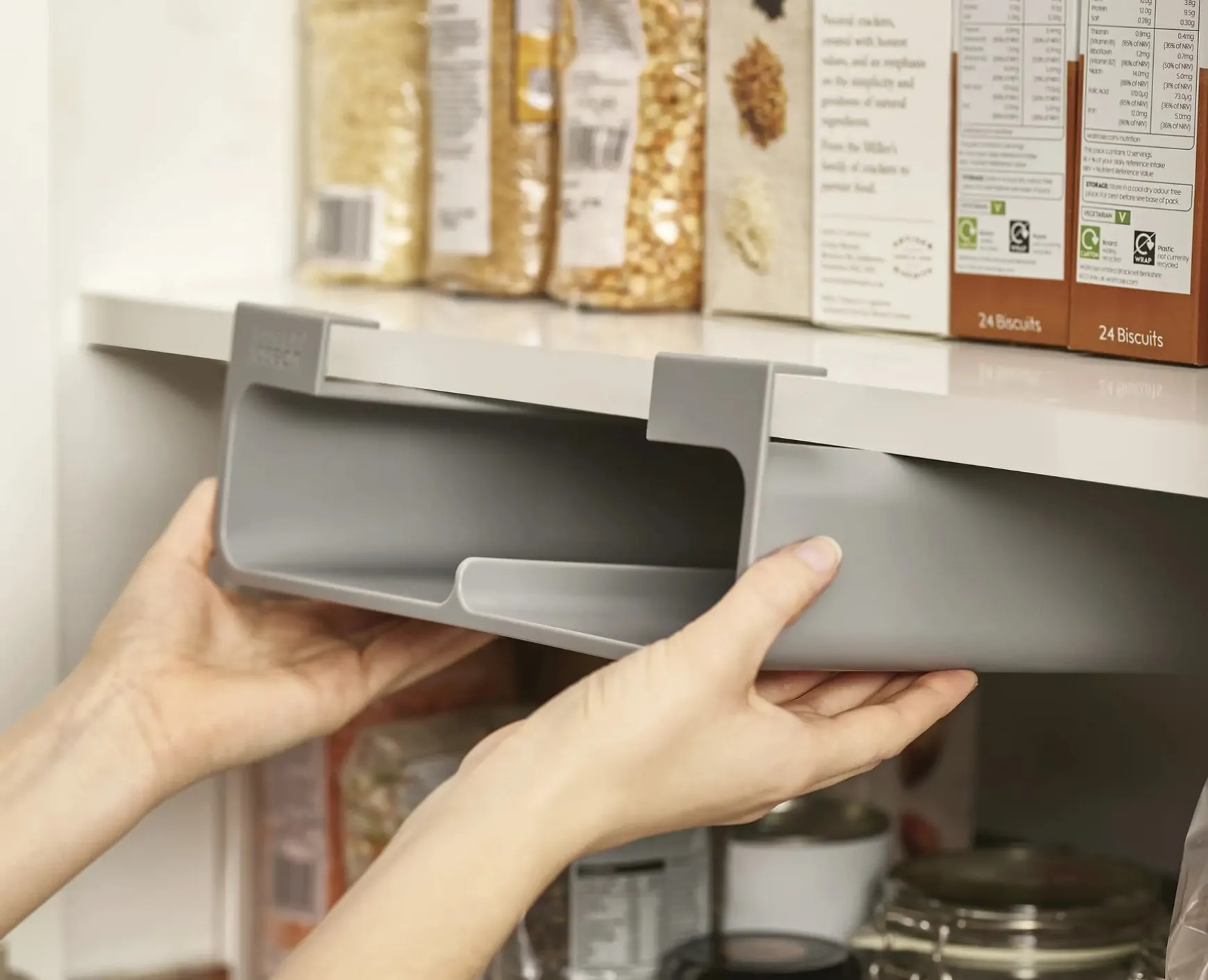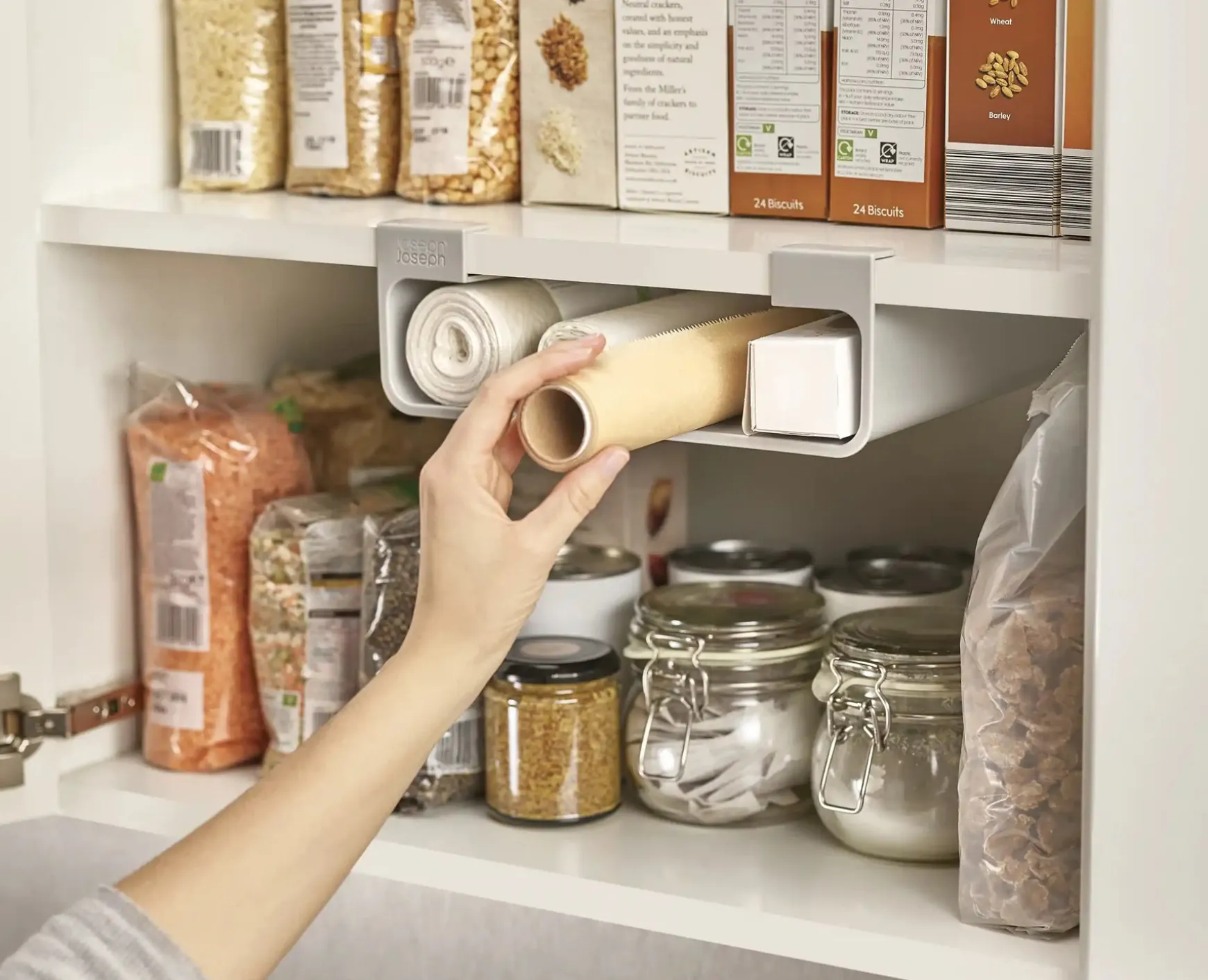Our CupboardStore™ range is designed to declutter and organize cupboards by making the best use of available and unused space. This easy-to-install design can be fitted under the shelf and features two open-ended compartments for storing items such as plastic wrap, baking foil and trash bags.