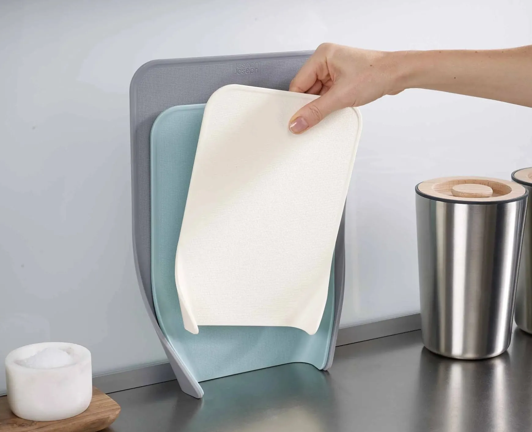 - All three boards can be stored upright on worktop