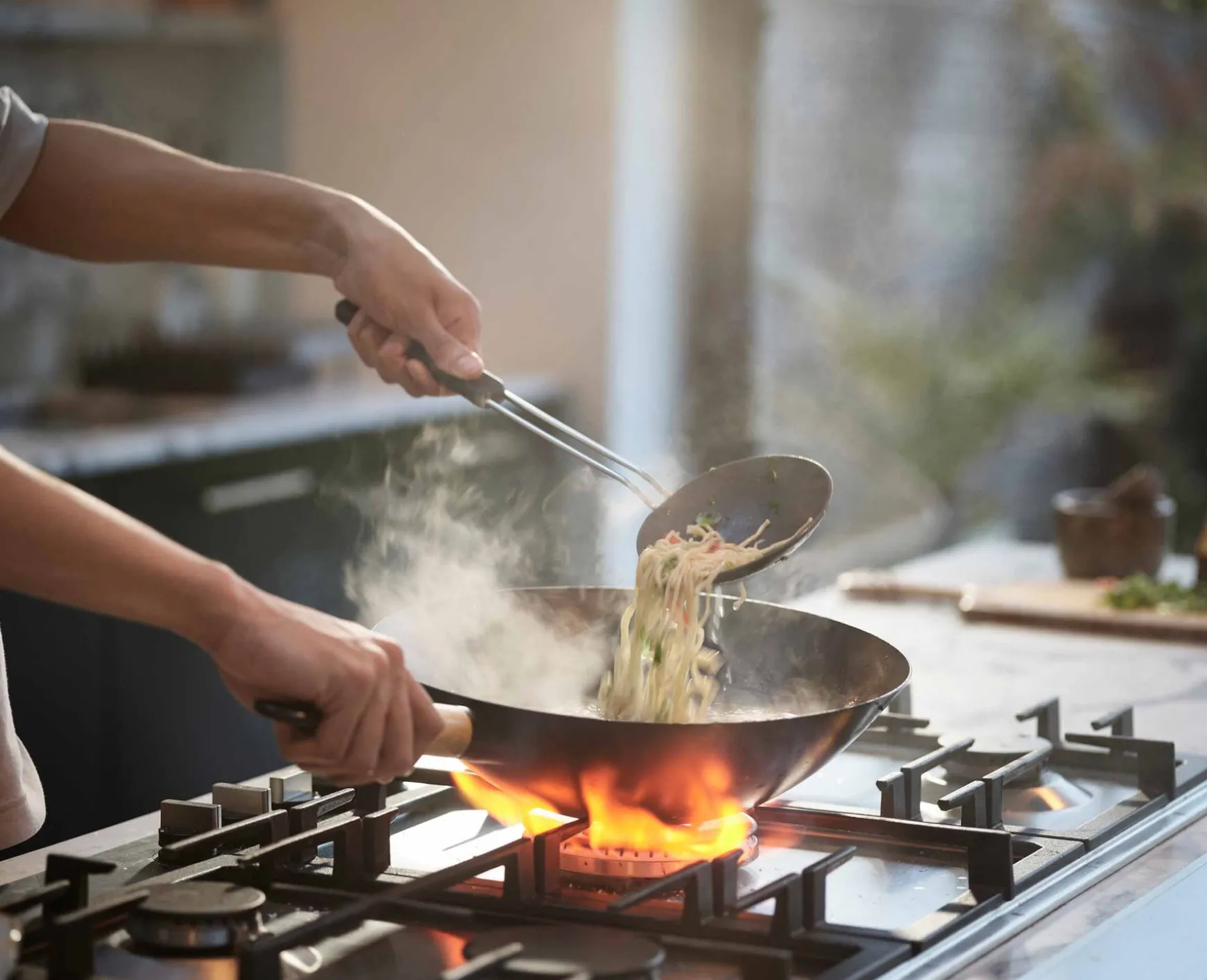 This handy wok utensils set includes a silicone turner, silicone spoon, and a stainless-steel wire skimmer, all with handles that fit together for space-saving storage. A wall-mounted hanging hook is also included for convenient access.