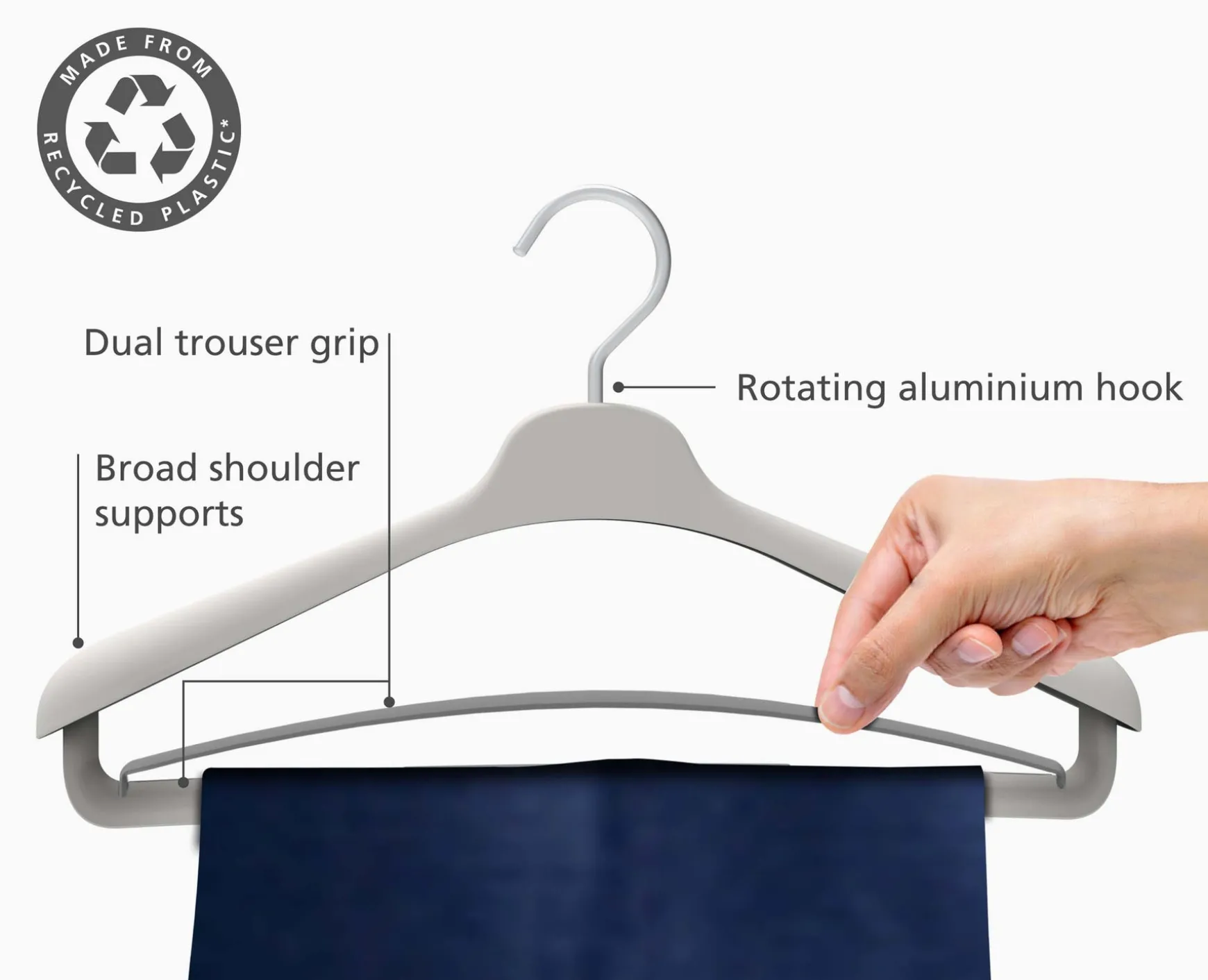 A hanger for your whole suit. Designed with broad shoulder supports and an elasticated grip to prevent trousers from slipping.